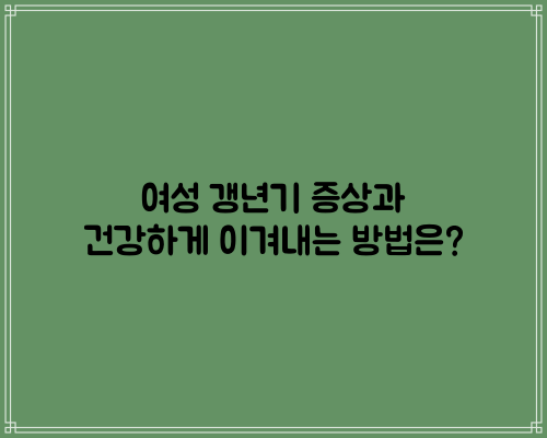 여성 갱년기는 누구에게나 찾아오는 자연스러운 변화입니다. 긍정적인 마음가짐과 올바른 자기관리를 통해 건강하게 이겨낼 수 있습니다. 생활 속 작은 실천과 전문적인 도움을 통해 보다 활기차고 안정된 갱년기를 보내시기 바랍니다.